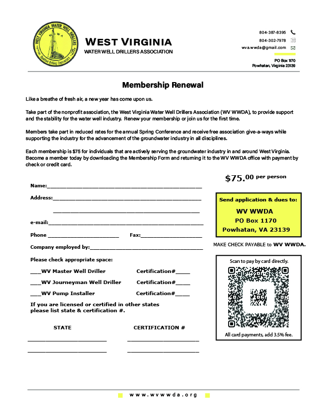 Memberships for the West Virginia Water Well Drillers Association is annual and individual. For convenience, you can renew with your conference registration or select the Membership Renewal Form and return it to the office with payment.